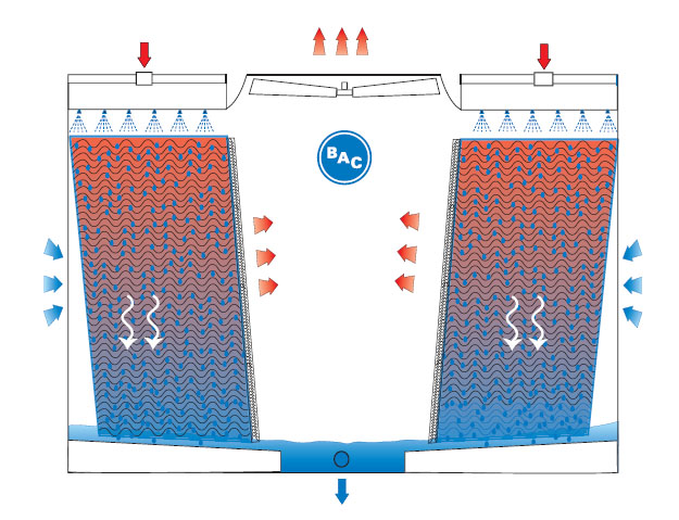 Теплая оборотная вода поступает в оросительную систему в верхней части градирни с обеих сторон и распределяется по поверхности теплопередачи. Осевой вентилятор в верхней части градирни продувают наружный воздух из боковой части агрегата через теплообменную поверхность. Специальные щиты на входе защищают устройство от попадания мусора. Теплая вода, контактируя с холодным воздухом, нагревает его, часть воды испаряется, обеспечивая оптимальный перенос тепла. В наклонном бассейне градирни собирается охлажденная вода, которая возвращается к источнику тепловой нагрузки. Теплый насыщенный воздух, проходя через каплеуловители, покидает градирню сверху.