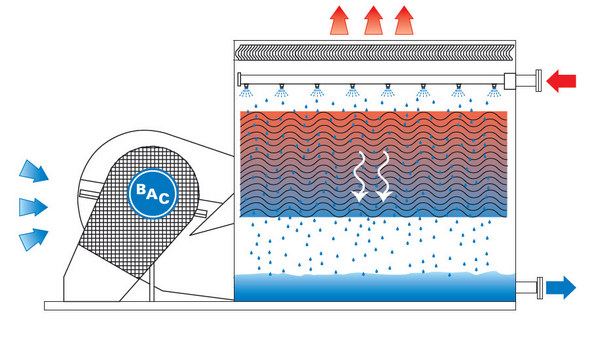 Теплая оборотная вода поступает в оросительную систему в верхней части градирни и распределяется по поверхности теплопередачи. Радиальный вентилятор в нижней части градирни продувает наружный воздух вверх через градирню. Теплая вода, контактируя с холодным воздухом, нагревает его, часть воды испаряется, обеспечивая оптимальный перенос тепла. В бассейне градирни собирается охлажденная вода, которая возвращается к источнику тепловой нагрузки. Теплый насыщенный воздух, проходя через каплеуловители, покидает градирню.