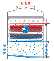 Главная особенность градирни PFI - система OptiCoil, включающая в себя среду охлаждения воды для орошения Versapak BAC, установленную внутри конструкции теплообменника. Это повышает общую эффективность охлаждения и обеспечивает оптимальное охлаждение технологической жидкости внутри теплообменника.Осевой вентилятор в верхней части градирни продувает наружный воздух из боковой части агрегата. Во время работы осуществляется теплопередача к воде для орошения, а затем в атмосферу в результате испарения части воды. Охлажденная технологическая жидкость покидает установку. Вода из системы орошения собирается в бассейне градирни и при помощи насоса снова подается в систему. Теплый насыщенный воздух, проходя через каплеуловители, покидает градирню сверху.