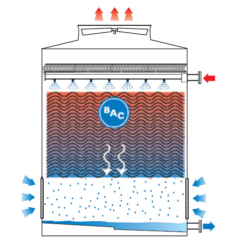 Теплая оборотная вода поступает в оросительную систему в верхней части градирни и распределяется по поверхности теплопередачи. Осевой вентилятор в верхней части градирни продувают наружный воздух из боковой части агрегата через теплообменную поверхность. Специальные щиты на входе защищают устройство от попадания мусора. Теплая вода, контактируя с холодным воздухом, нагревает его, часть воды испаряется, обеспечивая оптимальный перенос тепла. В наклонном бассейне градирни собирается охлажденная вода, которая возвращается к источнику тепловой нагрузки. Теплый насыщенный воздух, проходя через каплеуловители, покидает градирню сверху.